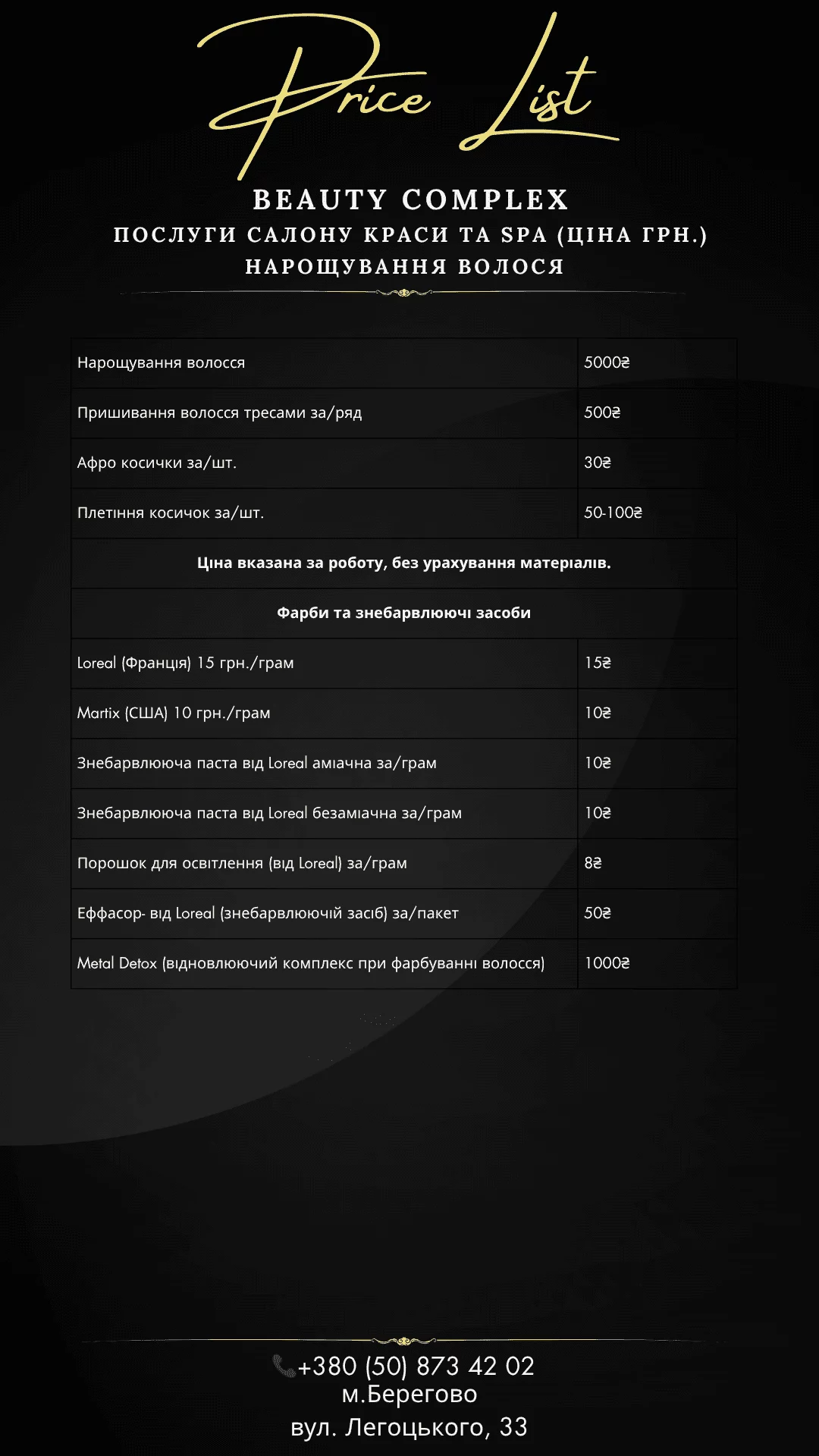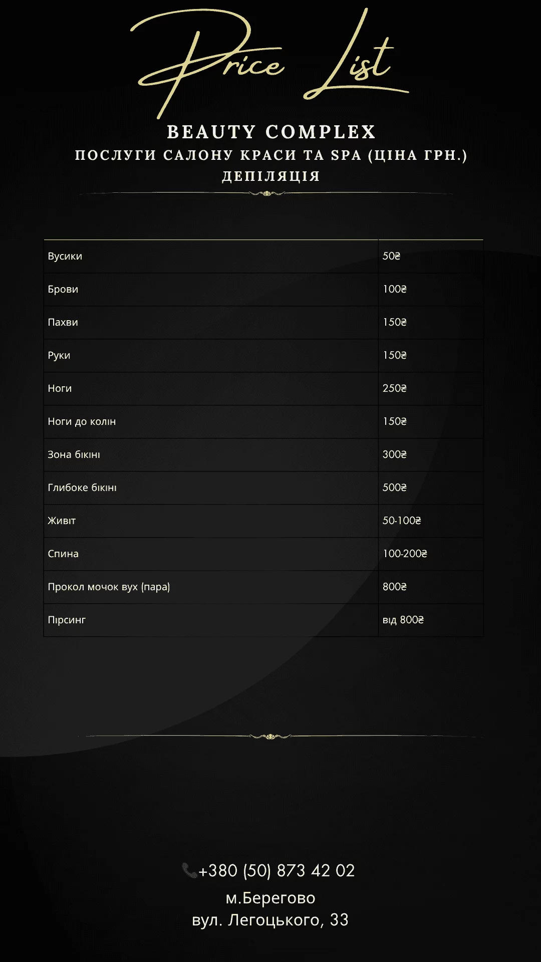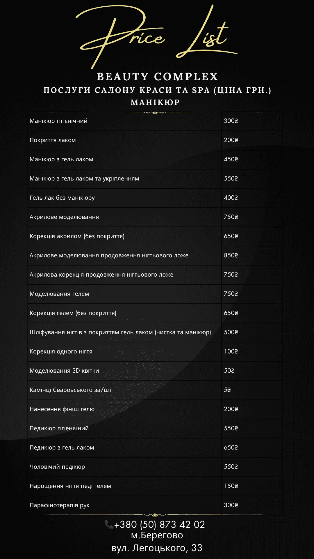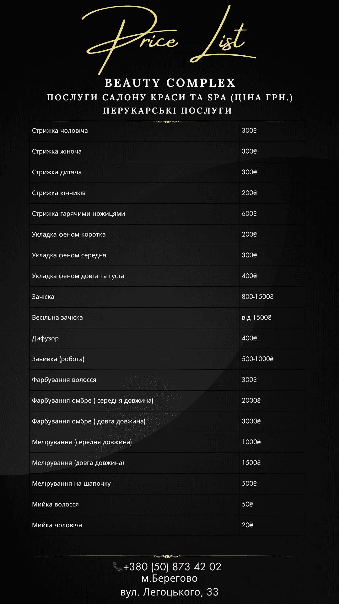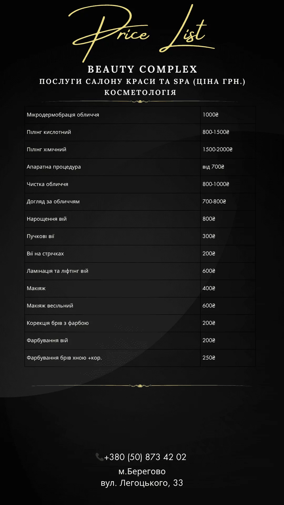 Послуги салону краси та SPA (ціна грн.)